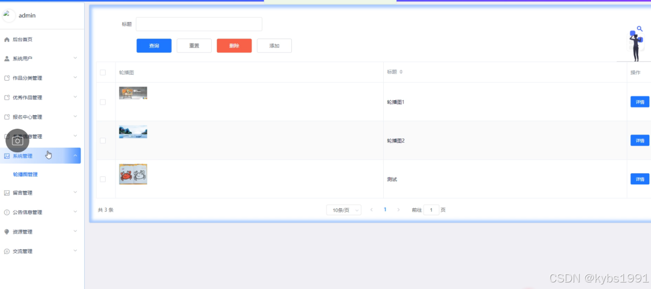 - 系统管理:管理员可以对系统轮播图进行设置、添加、修改和产出操作。