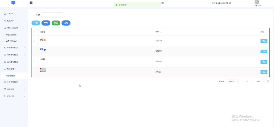 - 系统管理:管理员可以对系统前台的轮播图进行查询、添加、删除和修改操作。