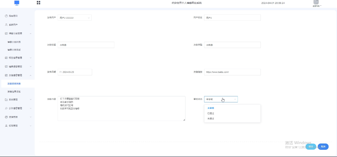 - 友链信息管理:管理员可以查阅友链信息详情和查看评论信息,也能添加新的友链信息,并可进行删除操作;同时可以进入详情页面审核友链信息。