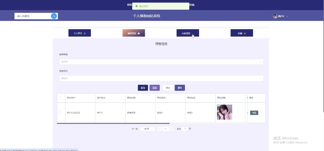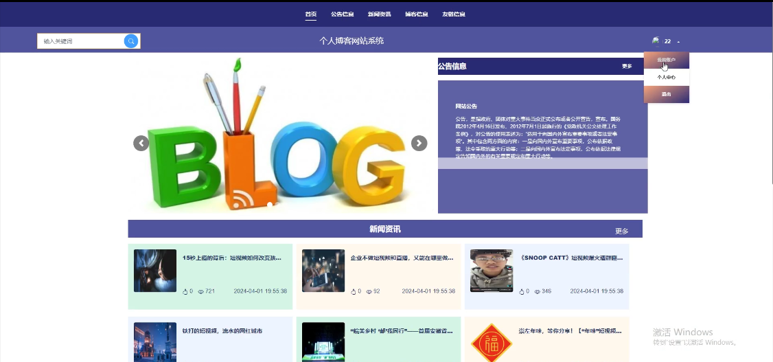 - 个人中心:在个人中心,用户可以对个人首页、博客信息、友链信息和收藏等信息进行查看和管理,并可添加博客信息和友链信息。