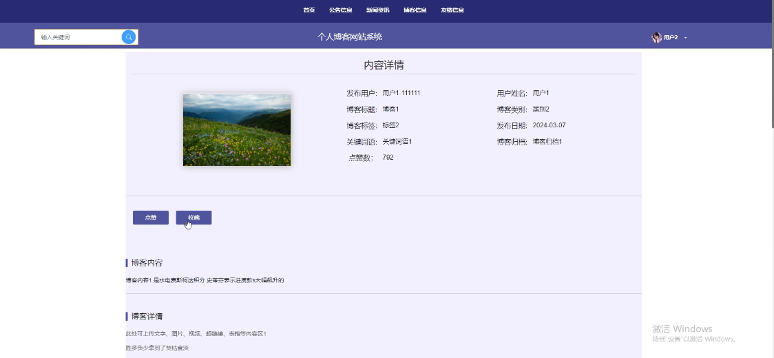 用户可以浏览发布的所有博客信息,包括发布用户、用户姓名、博客标题、博客类别、博客标签、发布日期、关键词语、博客归档、友链信息、博客内容、博客详情等详情信息,并可以对某一博客信息进行点赞、收藏和评论操作。界面如下图所示。