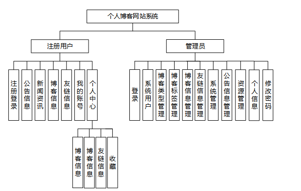 系功能模块分成了管理员及注册用户两个模块,每个模块登录进去对应相应的功能,具体的功能模块图如图3.1所示。