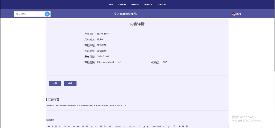 - 友链信息:用户可以搜索查看发布的友链信息,包括发布用户、用户姓名、友链标题、友链类型、发布日期、友链链接、点赞数、友链内容等详情信息,点击友链链接可跳转到相应页面,并可以对某一友链信息进行点赞、收藏和评论操作。