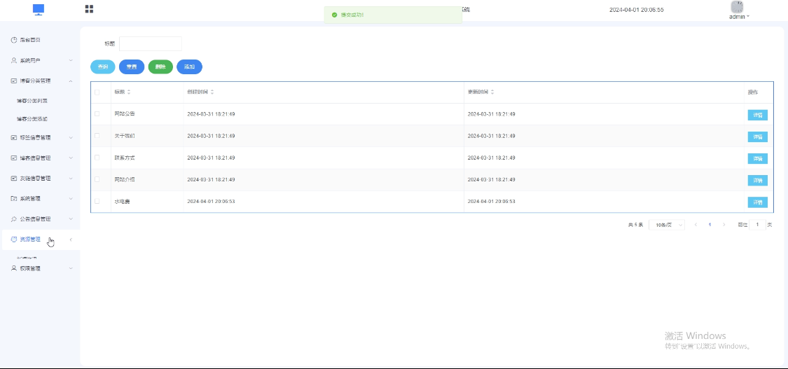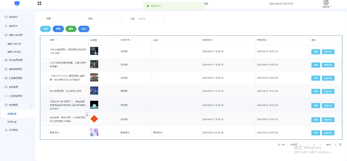 - 资源管理:管理员可以对系统的新闻资讯和新闻分类进行查询、添加、删除和修改操作,并可查看新闻资讯的评论信息。