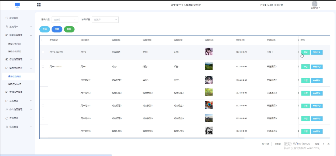 管理员可以查阅博客信息详情和查看评论信息,也能添加新的博客信息,并可进行删除操作。界面图如下所示。