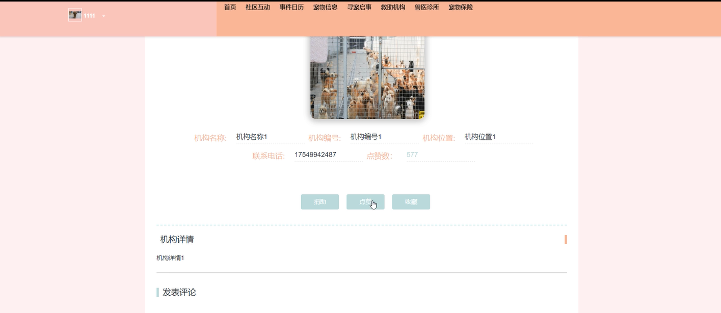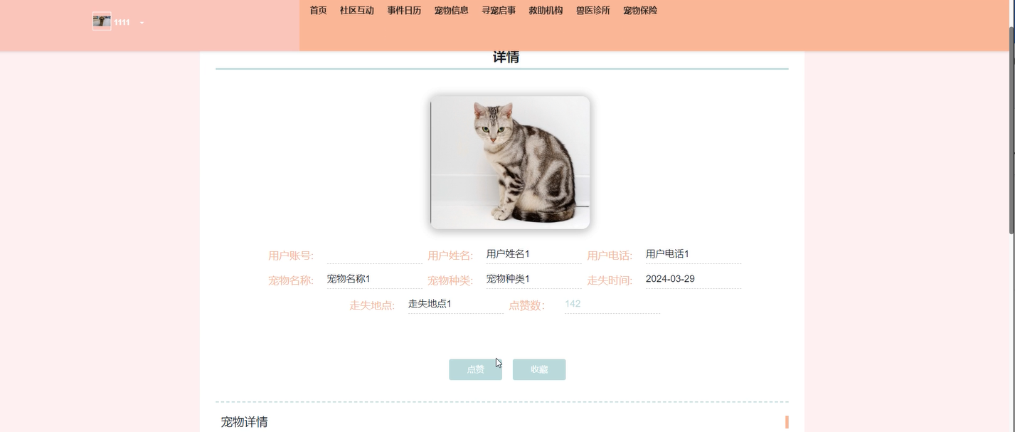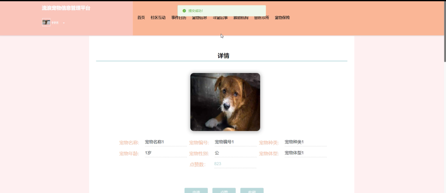 (3)宠物信息:用户进行宠物信息的阅览,通过查询宠物信息,可对某一个宠物信息进行申请+点赞+评论+收藏。