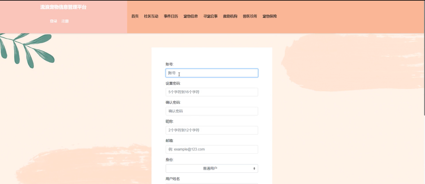 (1)用户注册登录:用户注册为普通用户并登录流浪宠物信息管理平台;用户对个人信息的增删改查,比如个人资料,密码修改。