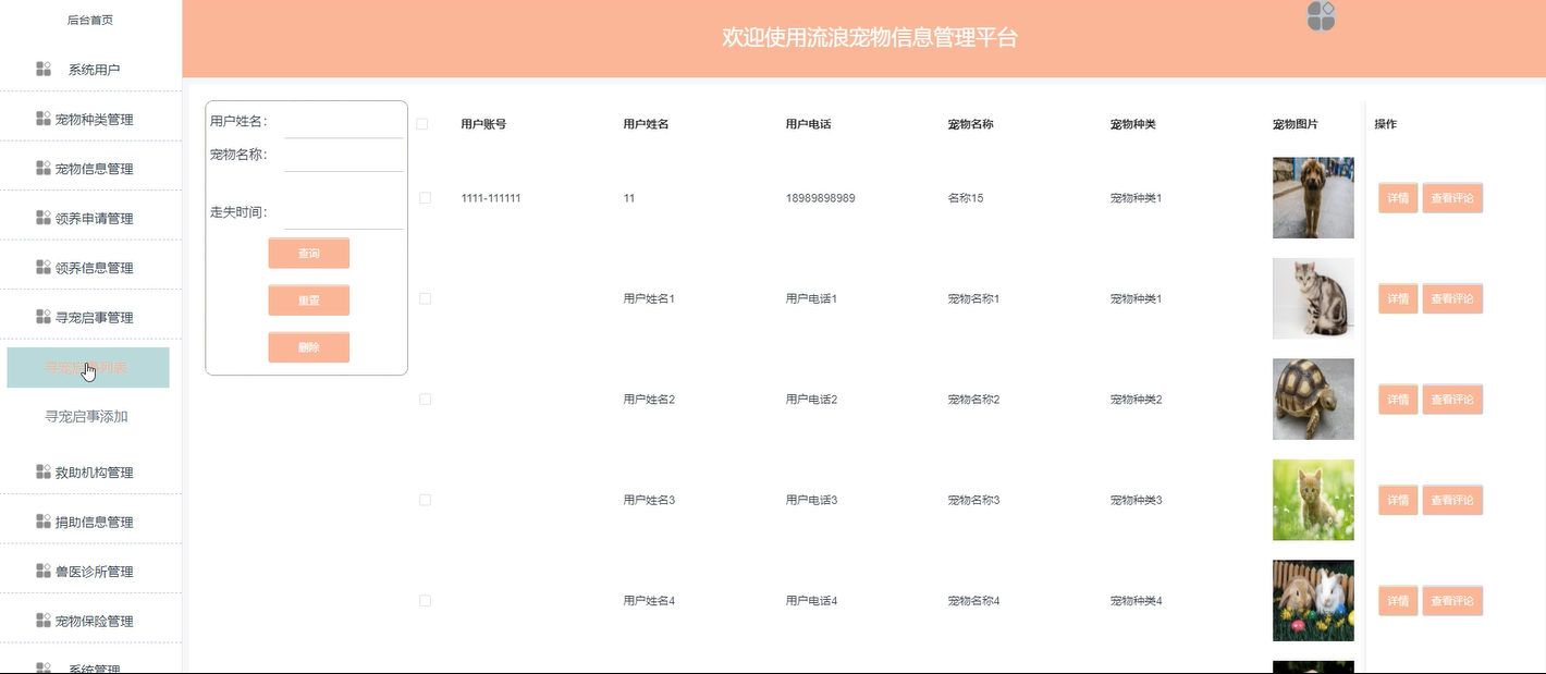 在当今社会,随着人们生活水平的提高,宠物已经成为许多家庭的重要成员。然而,流浪宠物的数量也在不断增加,它们面临着生存困境,同时给社会带来了诸多问题。因此,建立一个流浪宠物信息管理平台具有重要的现实意义。首先,该平台有助于提升流浪宠物的救助效率。通过集中管理流浪宠物的信息,包括种类、健康状况、救助需求等,可以让救助组织和志愿者更加迅速、准确地找到需要帮助的动物,减少救助过程中的盲目性和资源浪费。其次,平台能够增强公众的参与度和意识。通过线上线下的互动,让更多人了解流浪宠物的生存状态,激发人们的同情心和责任感。同时,平台还可以提供领养信息,帮助流浪宠物找到温暖的家,减少流浪动物的数量。最后,该平台还能为政府决策提供参考。通过对流浪宠物数据的分析,政府可以了解宠物管理的现状和问题,为制定相关政策提供科学依据,推动宠物管理的规范化和法制化。