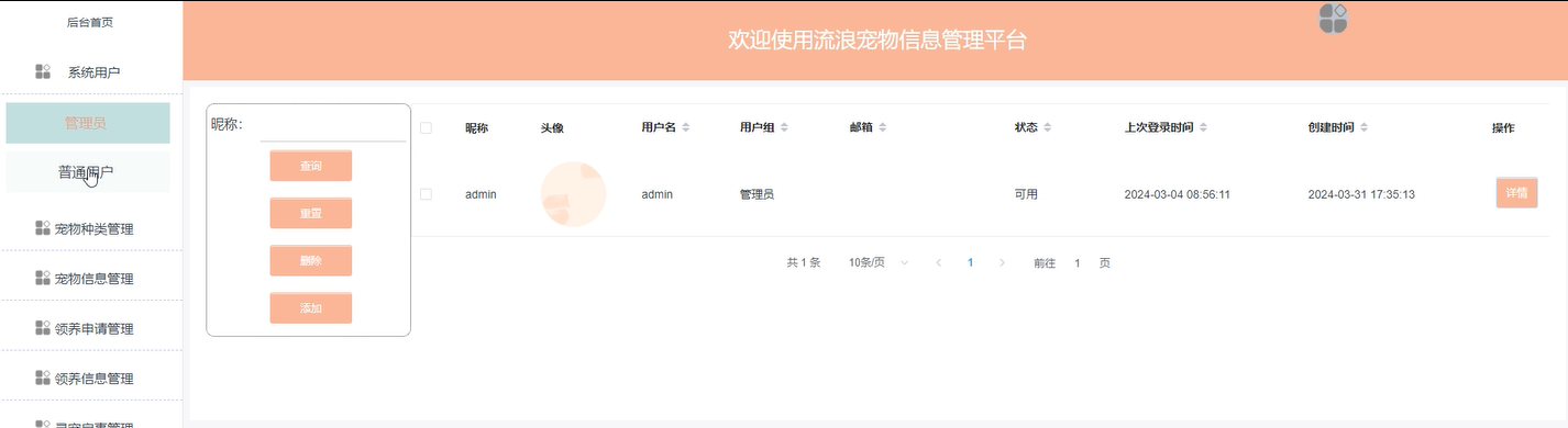 (2)系统用户:管理员点击“系统用户”这一菜单会显示管理员+普通用户这两个子菜单,管理员可以对这两个角色的信息进行增删改查操作。