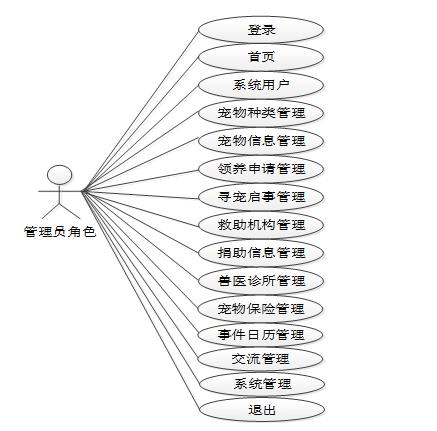 web后台管理上的管理员是维护整个流浪宠物信息管理平台中所有数据信息的。管理员角色用例如图2-4所示。