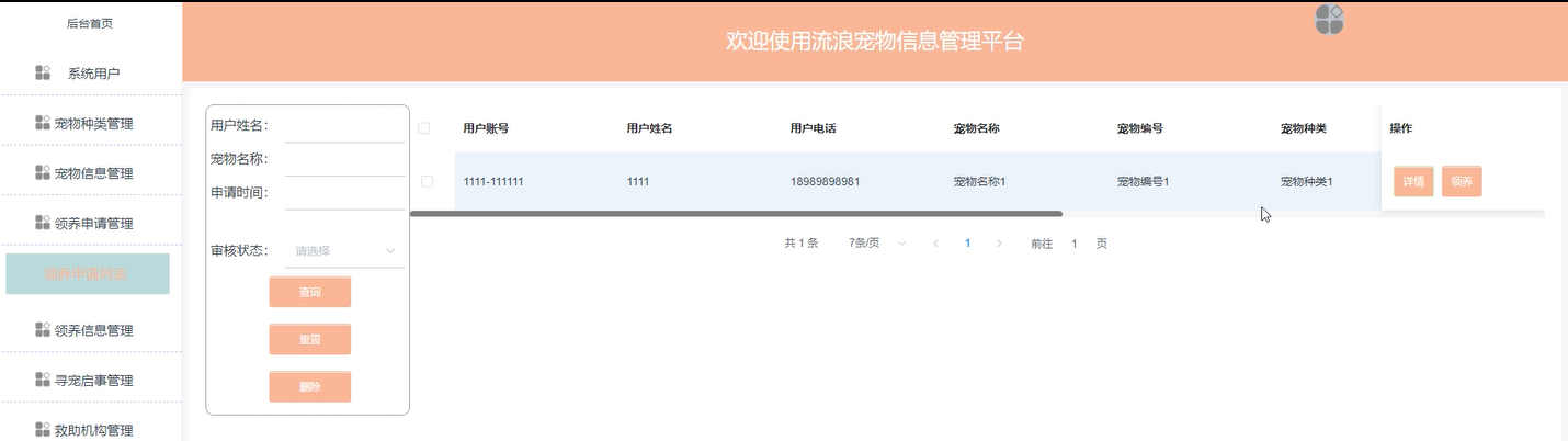 (4)领养申请:管理员点击“领养申请”菜单可以对领养申请进行管控。