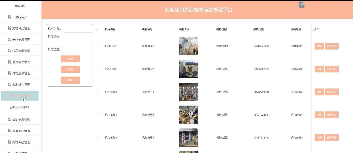 (6)救助机构:管理员点击“救助机构”菜单可以对救助机构进行增删改查。