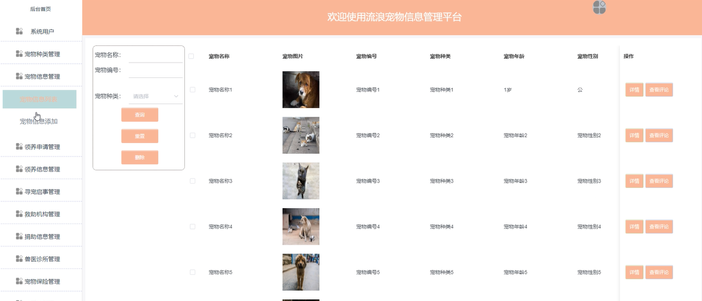 In today's society, the problem of stray pets is becoming increasingly serious, and proper management and assistance of them are crucial. Java technology has led to the emergence of the SpringBoot stray pet information management platform, which integrates functions such as pet information registration, adoption information release, pet seeking notice publicity, rescue agency promotion, veterinary clinic information links, and pet insurance recommendations. Users can quickly understand the current situation of stray pets through the platform, providing them with timely assistance and a warm home. The platform not only improves the efficiency and transparency of pet rescue, but also strengthens the connection between pet owners, rescue institutions, and veterinary clinics, providing comprehensive care and support for stray pets. Through this platform, we hope to arouse more people's attention and care for stray pets, and jointly create a social environment that cares for animals and promotes harmonious coexistence. Let every stray pet find a home, let every heart transmit warmth, and fill this world with love and hope.