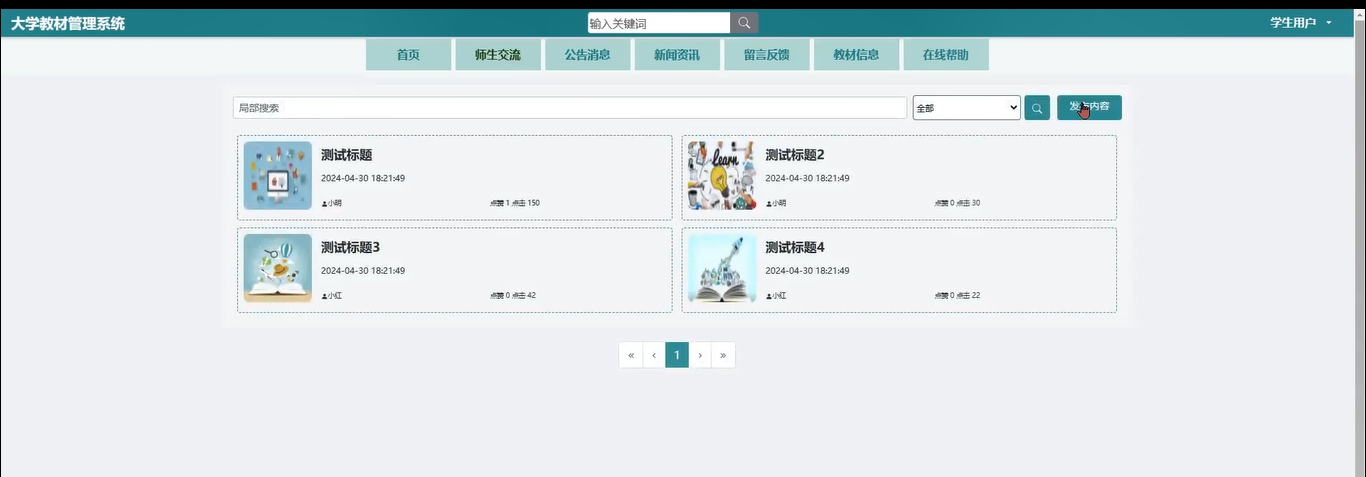 (2)师生交流:用户可点击“发布内容”按钮,上传封面图,输入标题,选择分类,输入标题和正文,点击“发表内容”进行交流发布;同时可对学生发布的交流内容进行查看评论。