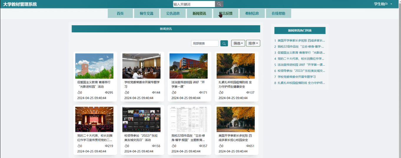 The design and implementation of university textbook management system is a development project based on Spring Boot framework, aiming at improving the efficiency and convenience of textbook management. The system integrates teaching materials information input, inventory management, borrowing and returning function modules, providing a centralized and efficient teaching materials management platform for teaching administration departments and teachers. Through the design and implementation of the system, it can optimize the textbook management process, improve the teaching quality and management efficiency.