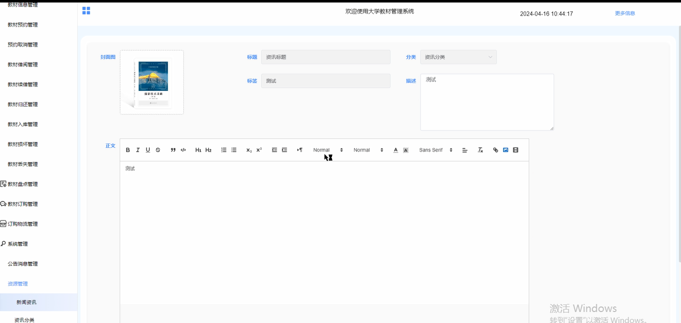 资源管理:管理员点击可查看新闻咨讯和咨讯分类;如需添加新的咨讯,上传封面图,输入标题,选择分类,输入标签、描述和正文,点击“提交”按钮进行添加。同时可对咨讯进行增删改查。界面如下图所示。