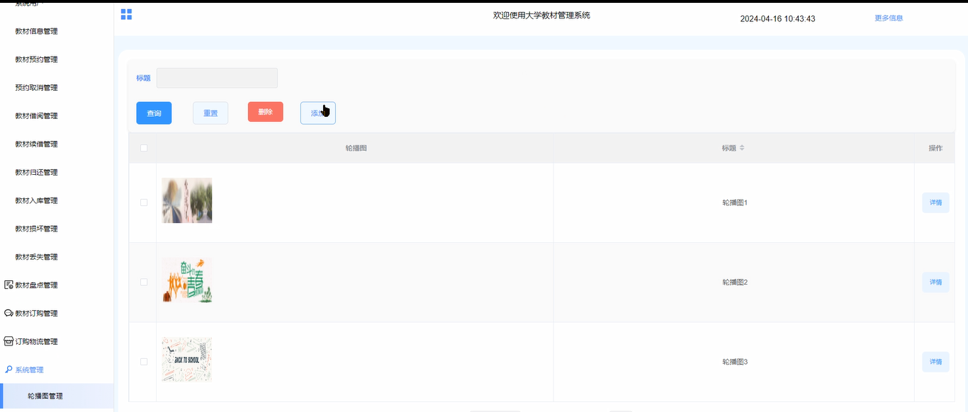 (17)系统管理:当管理员点击“系统管理”时,可查看轮播图; 如需添加新的轮播图,点击右侧“添加”按钮,上传图片,输入标题,点击“确认”按钮进行添加;同时可对轮播图进行增删改查。