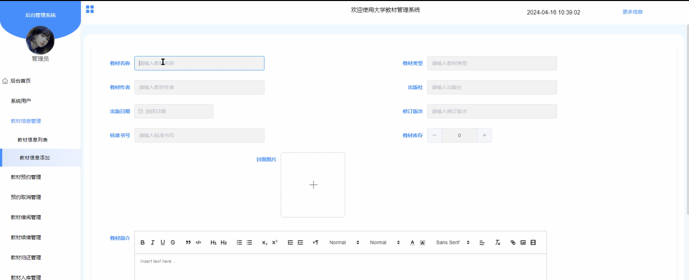 教材信息管理:管理员点击可查看教材信息列表和教材信息添加;点击“教材信息添加”,输入教材名称、教材类型、叫教材作者、出版社,选择出版日期,输入修订版次、标准书号、教材库存,上传封面图片和输入教材简介。同时可进行预约、借阅、入库、损坏、丢失、盘点和订购操作。界面如下图所示。