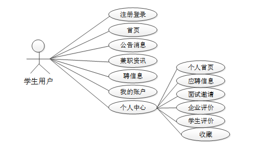 - 学生用户功能主要包括注册登录、首页、公告消息、兼职资讯、招聘信息、我的(我的账户、个人中心),其用例图如下图2-4所示。