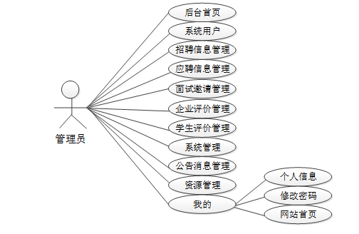 2. 管理员功能主要包括后台首页、系统用户、招聘信息管理、应聘信息管理、面试邀请管理、企业评价管理、学生评价管理、系统管理、公告消息管理、资源管理、我的(个人信息、修改密码、网站首页)。其用例图如下图2-5所示。