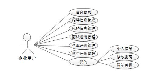 3.企业用户功能主要包括后台管理、招聘信息管理、应聘信息管理、面试邀请管理、企业评价管理、学生评价管理、我的(个人信息、修改密码、网站首页)。其用例图如下图2-6所示。