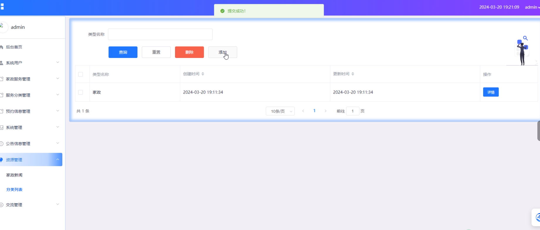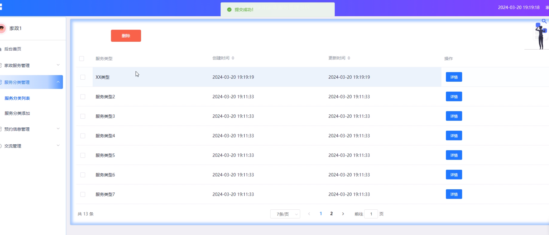 服务分类管理:家政用户管理家政服务的分类信息,包括添加新的服务分类、编辑和删除现有的服务分类等操作。界面如下图所示。