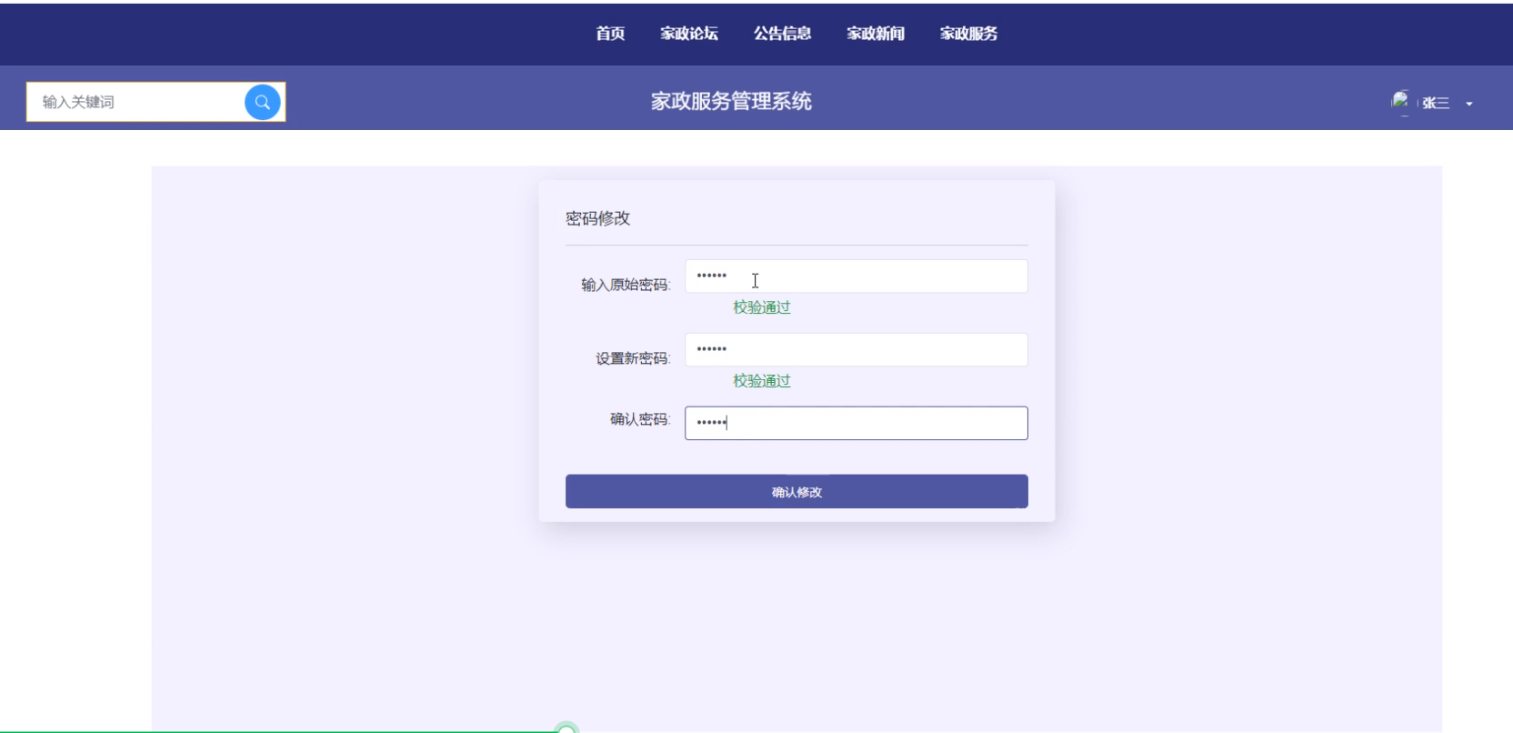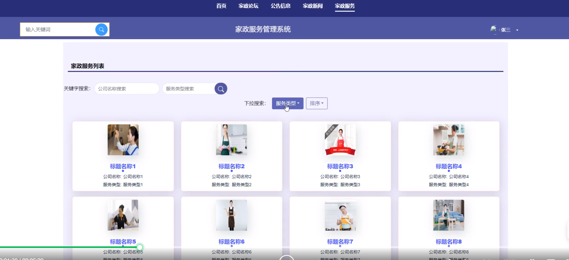 首页:用户登录后可以浏览到家政服务管理系统的首页,显示最新的公告信息、家政新闻、热门服务等内容,方便用户了解家政服务的相关信息。