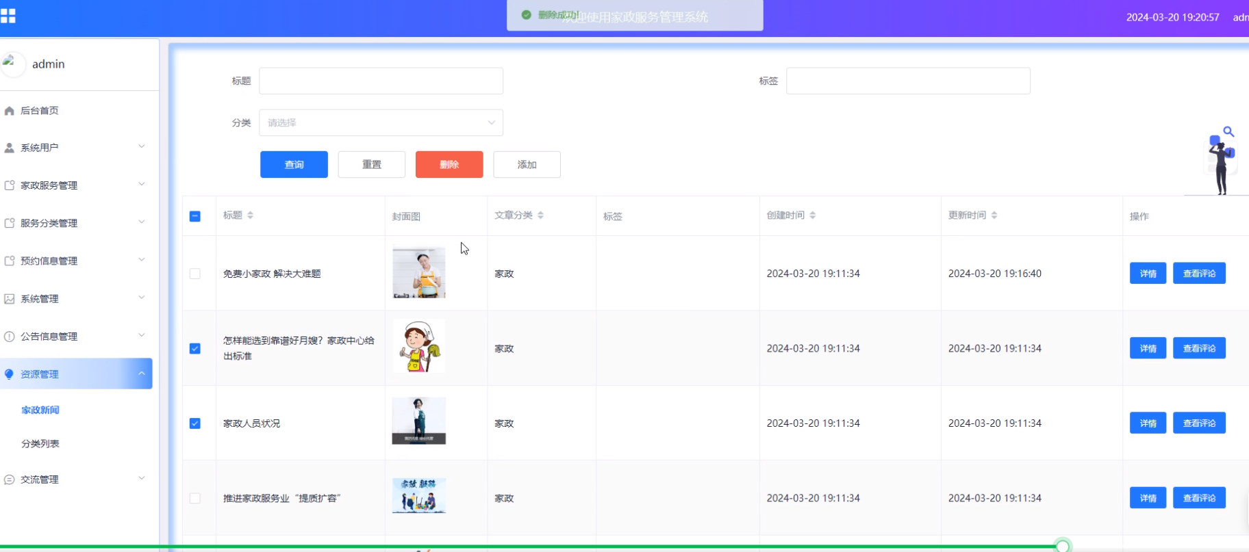 资源管理:管理员管理家政新闻+分类列表这两个子菜单,可以对这两个模块进行增删改查操作。界面如下图所示。