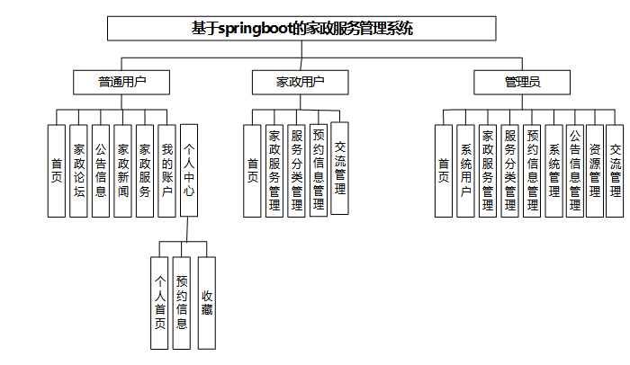 系功能模块分成了管理员、普通用户、家政用户三个模块,每个模块登录进去对应相应的功能,具体的功能模块图如图3.1所示。