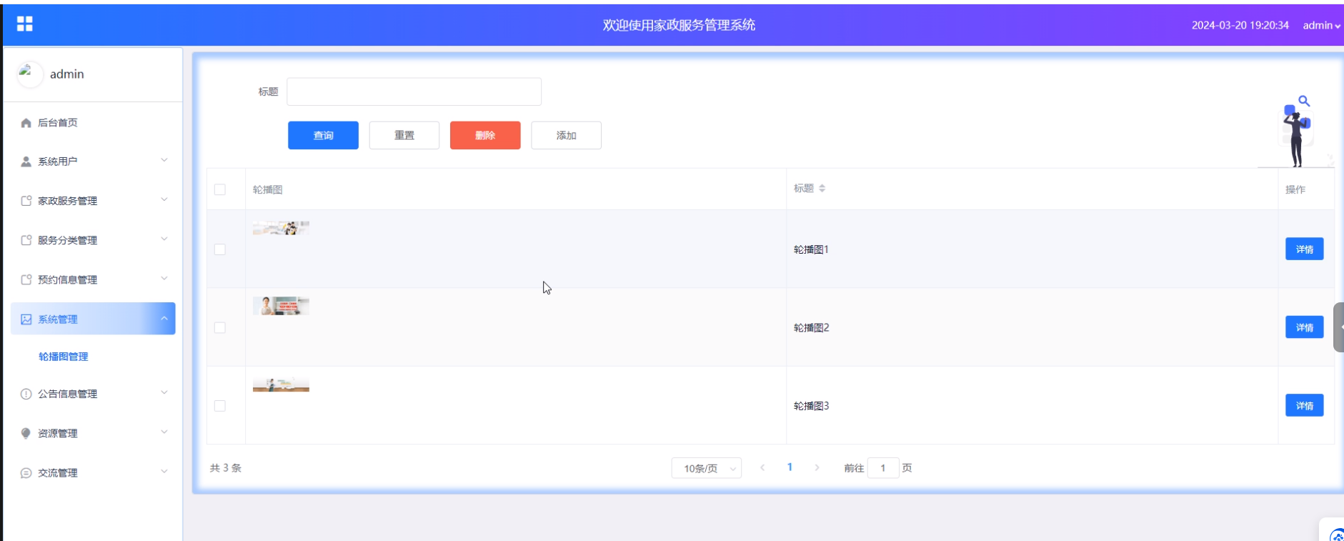 管理员可以对系统前台展示的轮播图进行增删改查,方便用户进行查看。轮播图管理界面如下图所示。界面如下图所示。