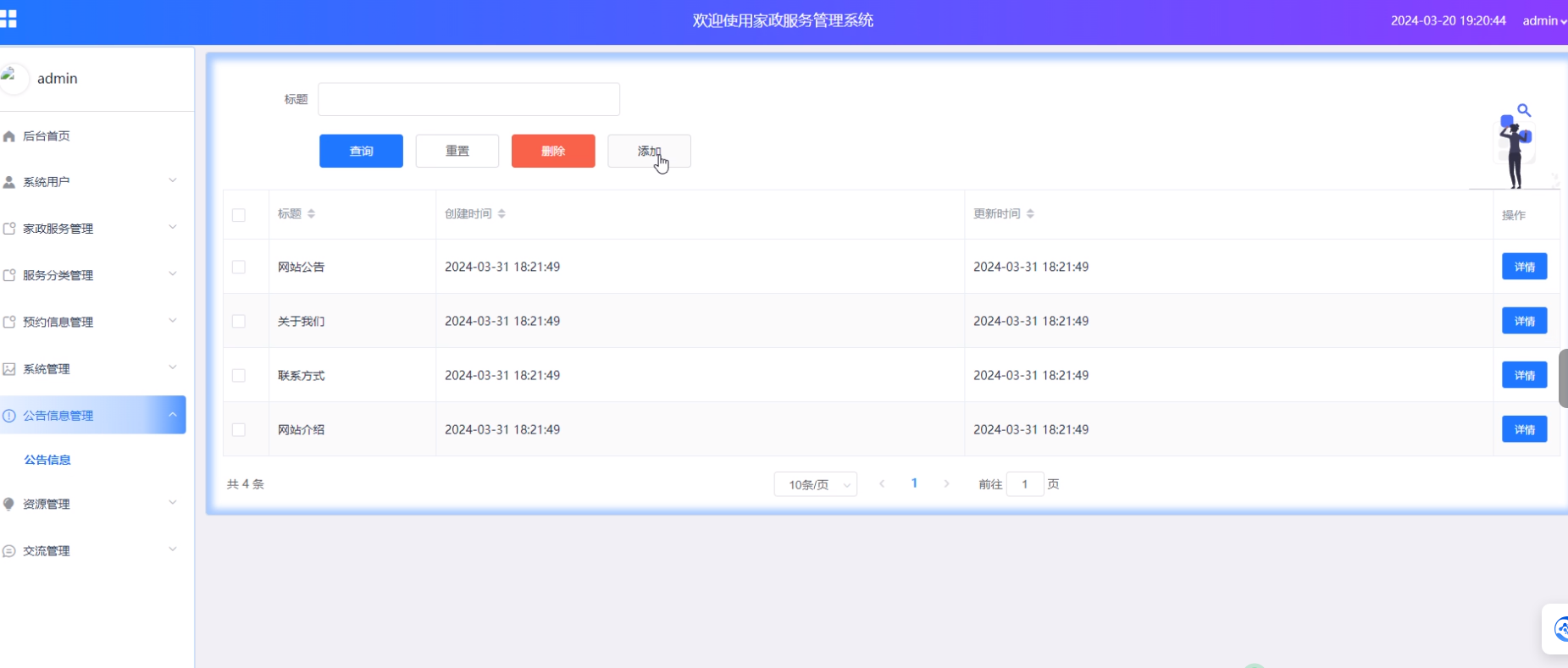公告信息:用户能够查看系统发布的公告信息,包括家政服务更新、系统维护通知等内容。