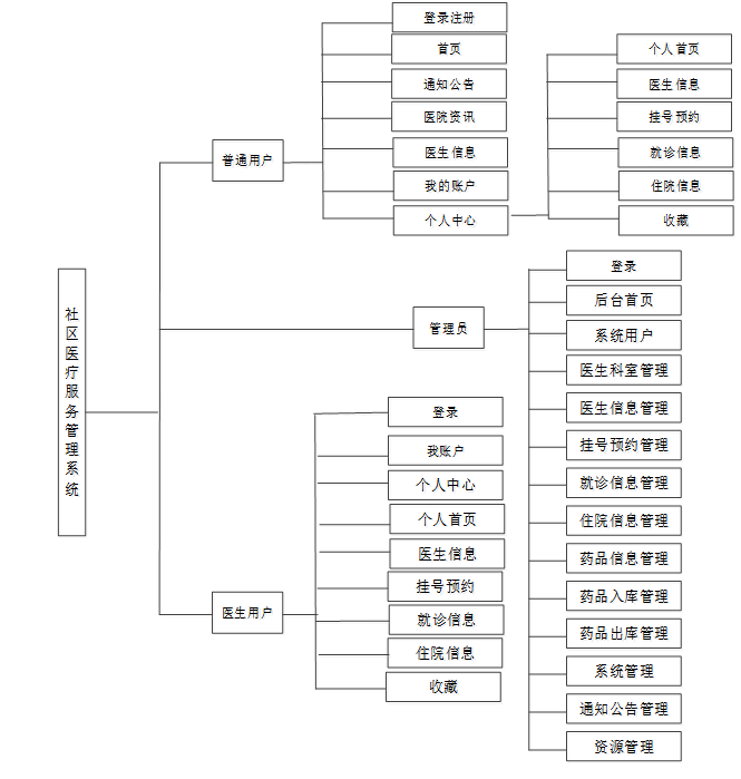 按照基于SpringBoot的社区医疗服务管理系统的角色,主要包括普通用户模块、医生用户模块和管理员模块,其主要内容如下: