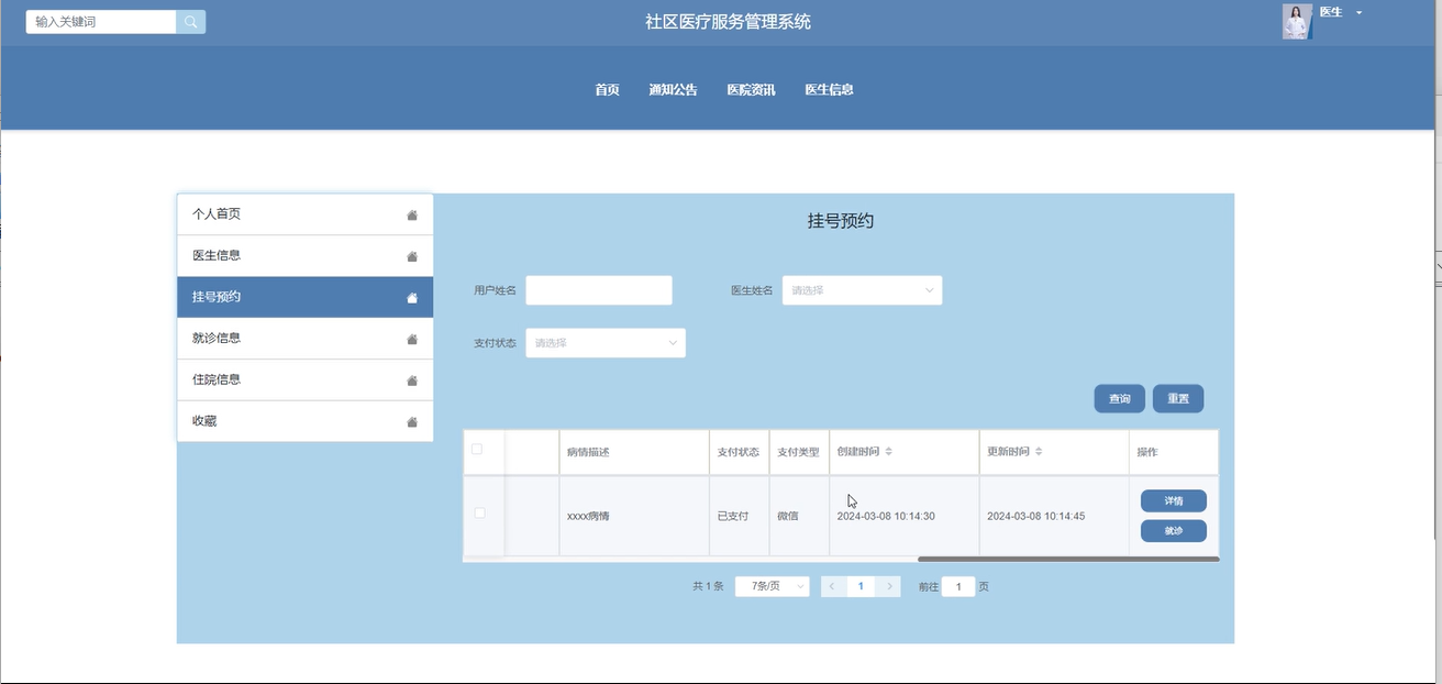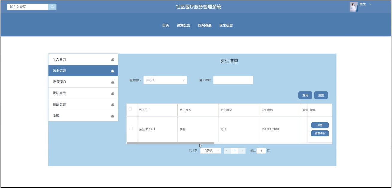 (3)医生信息:可以查看医生信息详情及评论,根据需要进行查询、重置等操作。