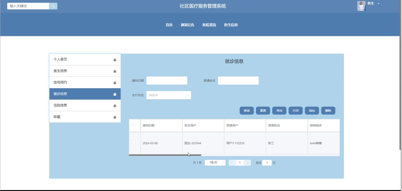 (5)就诊信息:可以查看用户具体就诊的详情信息进行增删改查,对就诊资料进行导出和打印并对用户进行安排住院信息填写等操作。