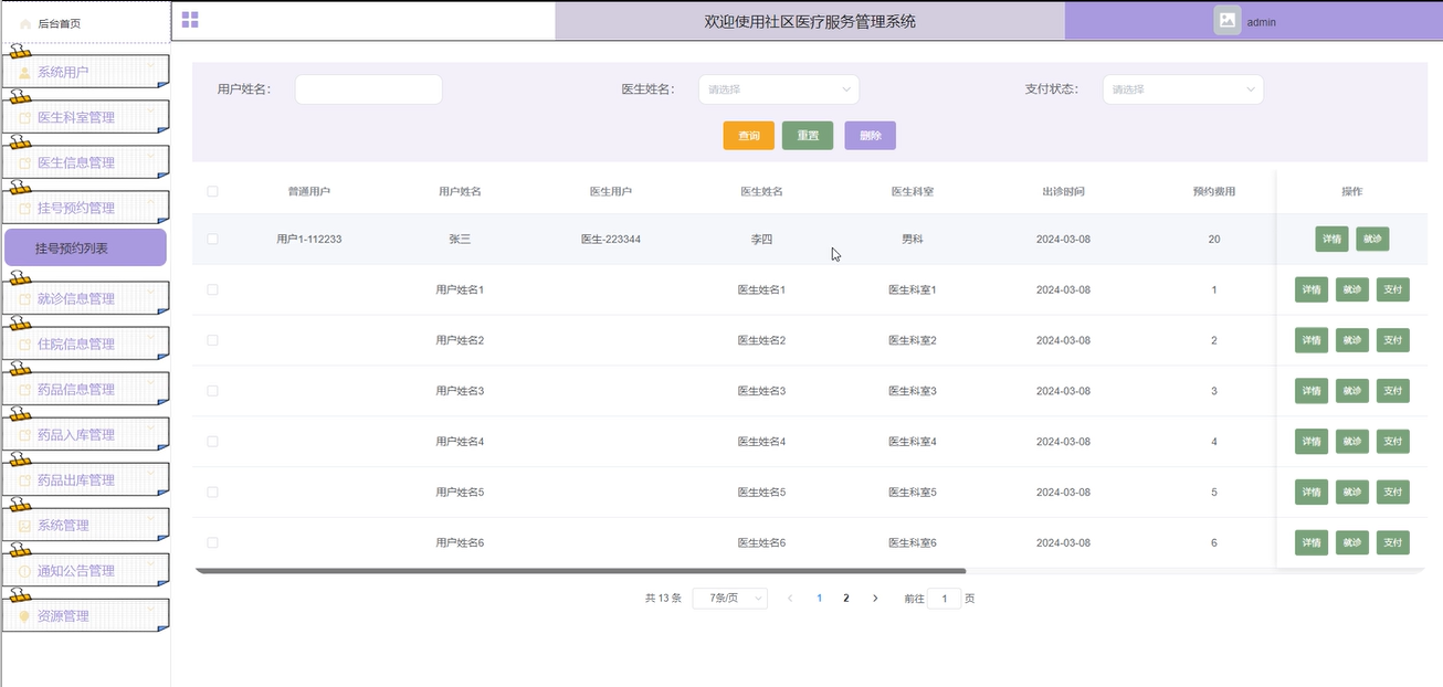 (5)挂号预约管理:管理员可以查看挂号预约信息列表中的某一挂号预约信息详情及就诊信息和用户的支付信息,可以添加就诊提醒信息。
