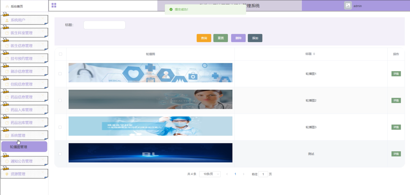 (11)系统管理:管理员可以查看轮播图列表中的某一轮播图详情,可以对系统轮播图进行查询、添加和删除管理。