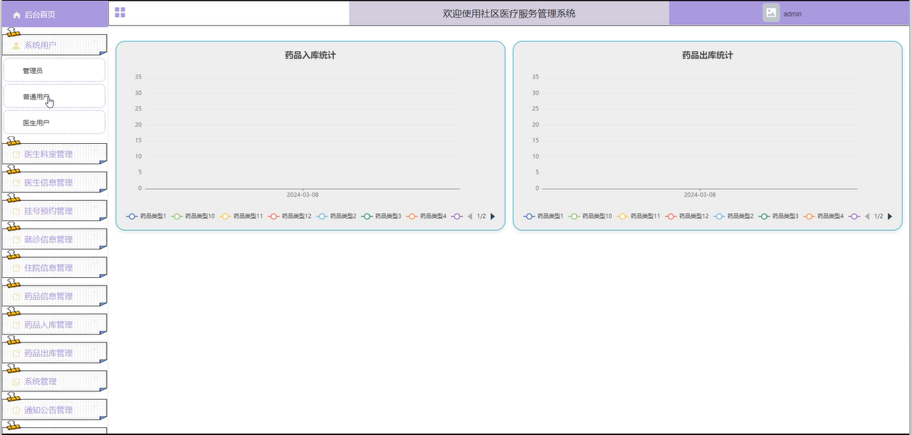 可以查看药品入库、出库的数据统计图信息。其界面如下图4-13所示。