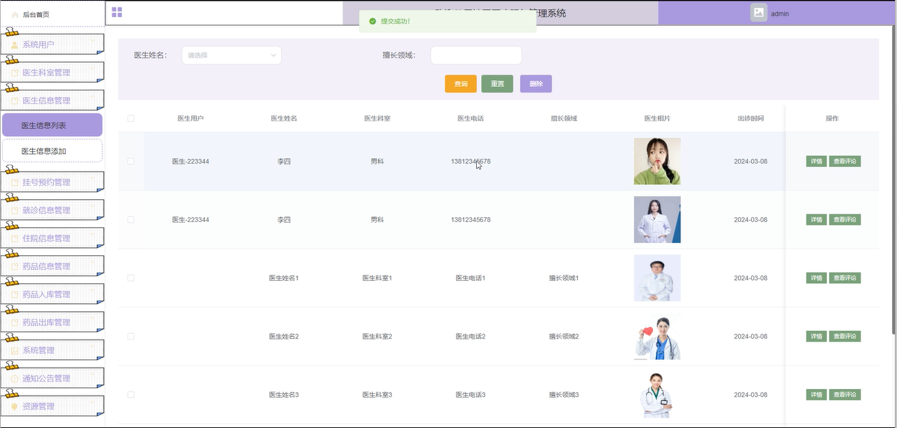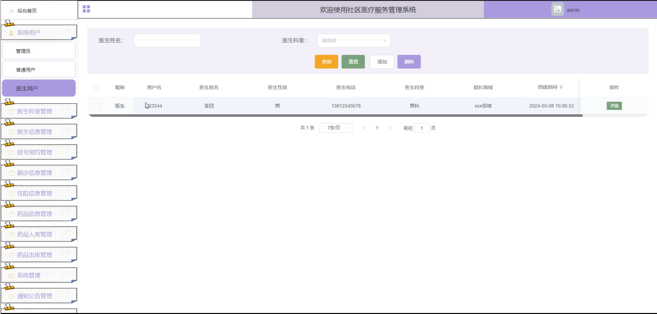 (4)医生信息管理:管理员可以对医生信息管理里的列表进行详情查看,可以对医生信息管理进行添加,可以查看医生信息管理列表中的某一信息详情,也可以对医生信息管理列表进行查询和删除操作。