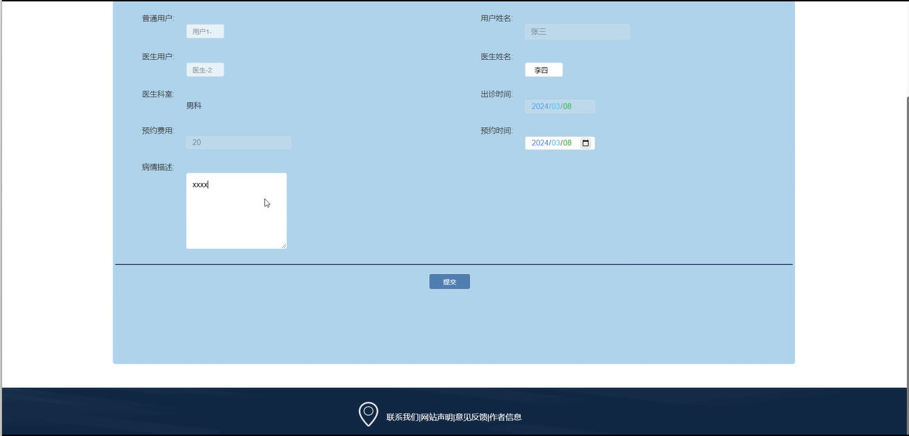 (4)挂号预约:可以查看用户在前台对医生的挂号预约信息等并进行就诊建档信息的填写等操作。