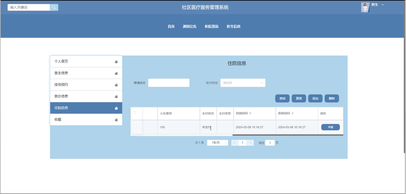 (7)住院信息管理:管理员可以查看用户的住院信息列表中的某一信息详情,可以对住院信息列表信息进行查询、重置和删除并对用户的支付信息管理等操作。