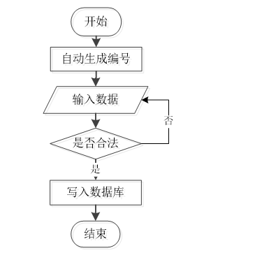 用户成功登入系统后就能够实现增加数据的操作,增加数据的编号是特定的,系统生成,用户不能随意填写,除了编号以外,其他增加信息用户自己填写,填写后的信息经过系统验证,验证合法通过就显示增加数据成功了,相反的话,就没有增加成功,图2-1显示的就是在增加数据时的流程。