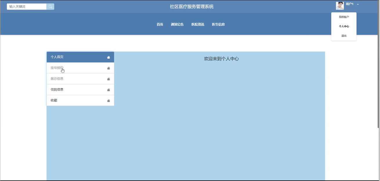 (2)个人中心首页:可以查看首页包含的所有功能:医生信息、挂号预约、就诊信息、住院信息和收藏。