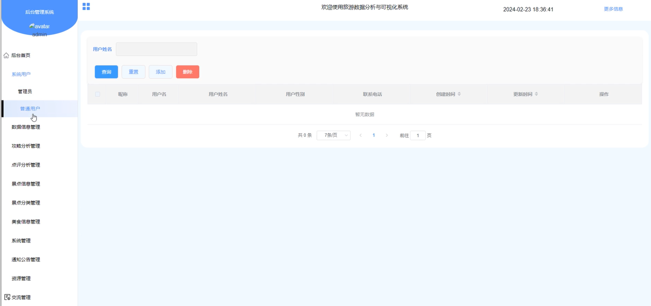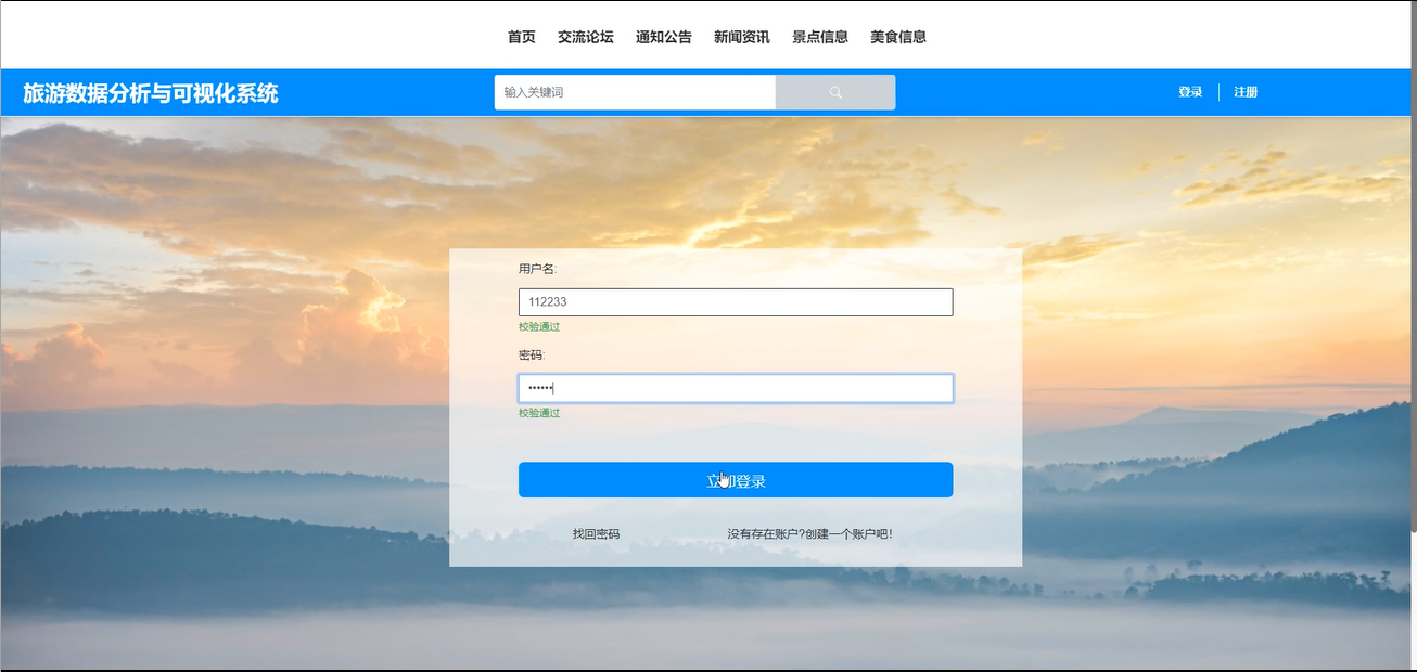 本旅游数据分析与可视化系统开发是一个通过浏览器自主查询、交流的平台,用户想要参与进来,必须有账号和密码,登录后方可交流,管理员则实现对用户的管控,如下图: