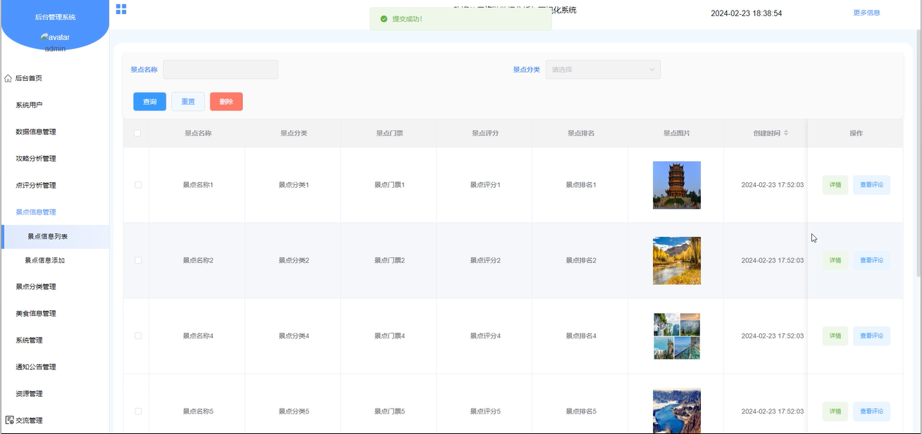 (7)景点信息管理:景点信息:管理员点击“景点信息”会显示出所有的景点信息,支持输入景点名称对景点信息进行查询,如果想要添加新的景点信息,点击“添加”按钮,输入景点名称、景点分类、景点门票、景点评分、景点排名、景点图片、景点简介、创建时间等信息,点击“提交”按钮就可以添加了,同时可以选择某一条景点信息,点击“删除”进行删除,也可以对用户提交的景点信息评论的信息进行管控。