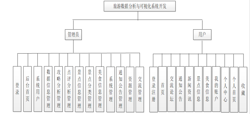 本旅游数据分析与可视化系统开发是一个集信息查询、发布、管理为一体的平台,在功能上实现了前台和后台两部分的功能,根据第三章的系统功能分析,得出本旅游数据分析与可视化系统开发的功能模块图,如图3-1所示。