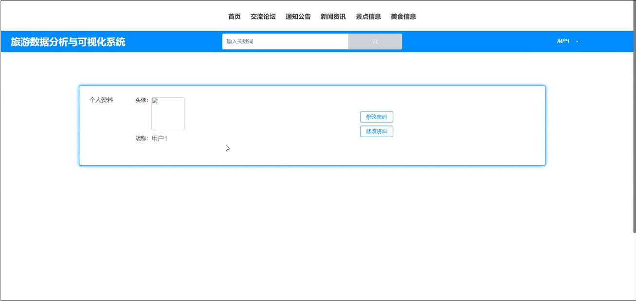 (2)查看旅游数据分析与可视化系统开发的首页信息:旅游数据分析与可视化系统开发的首页信息包含了首页、交流论坛、通知公告、新闻资讯、景点信息、美食信息。