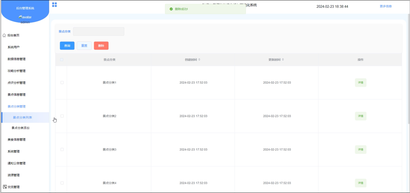 管理员点击“景点分类”会显示出所有的景点分类信息,支持输入景点名称对景点分类进行查询,如果想要添加新的景点分类,点击“添加”按钮,输入景点分类、创建时间等信息,点击“提交”按钮就可以添加了,同时可以选择某一条景点分类,点击“删除”进行删除。界面如下图4-12所示。