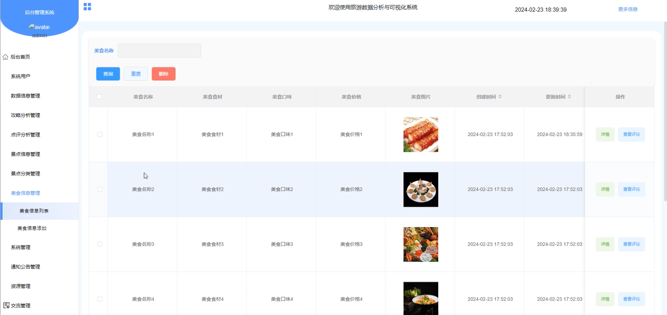(9)美食信息管理:管理员点击“美食信息”会显示出所有的美食信息,支持输入美食名称对美食信息进行查询,如果想要添加新的美食信息,点击“添加”按钮,输入美食名称、美食食材、美食口味、美食价格、美食图片、美食内容介绍等信息,点击“提交”按钮就可以添加了,同时可以选择某一条美食信息,点击“删除”进行删除,也可以对用户提交的美食信息评论的信息进行管控。
