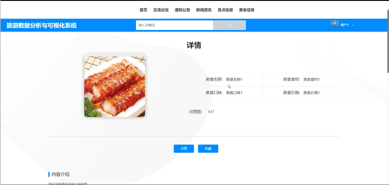 (7)美食信息:用户点击“美食信息”菜单可以查看所有美食信息,可以按照条件查看美食信息,或者输入关键词进行查询,点击可以进入美食信息详细展示界面,在此界面用户可以收藏、点赞和评论,美食为热度推荐、根据用户点击率推荐、最高的排在前面。