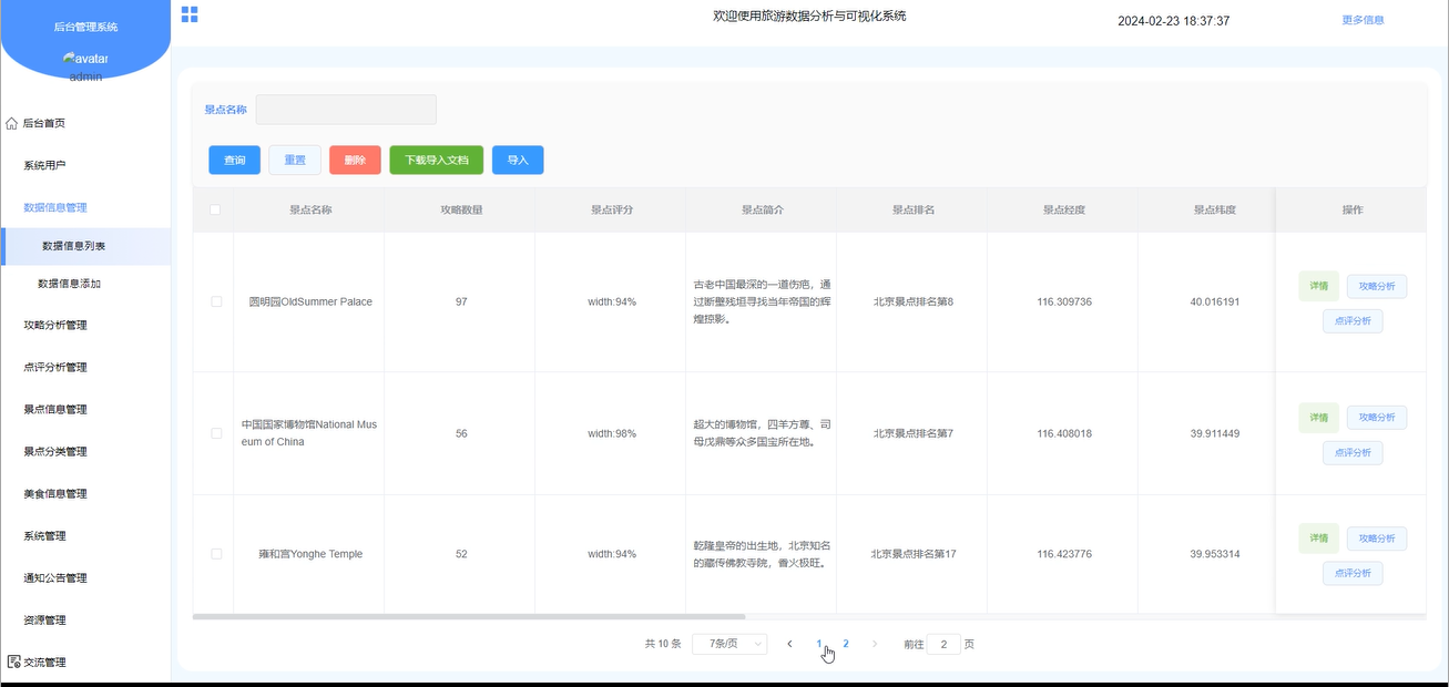 (4)数据信息管理:管理员点击“数据信息”会显示出所有的数据信息,支持输入景点名称对数据信息进行查询、先下载导入文档,把数据复制进去后导入数据,如果想要添加新的景点信息,点击“添加”按钮,输入景点名称、攻略数量、评分、简介、排名、经度、维度等信息,点击“提交”按钮就可以添加了,同时可以选择某一条景点信息,点击“删除”进行删除,也可以对用户提交的数据信息详情、攻略分析、点评分析进行管控。